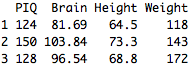 #check dataframe #this is an American dataset, so the participant's weight is in pounds not kilos! head(iqSize, 3)
