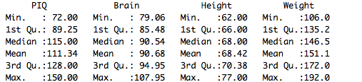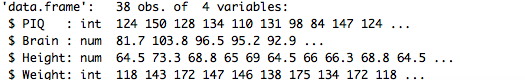 fit <- lm(PIQ~ Brain + Height + Weight, data=iqSize) summary(fit)