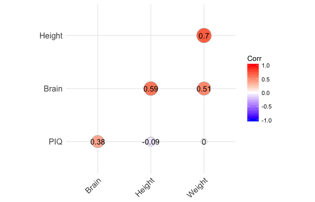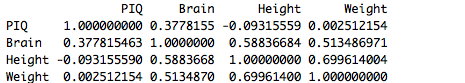 I decided to create a step-by-step guide on creating a correlation matrix using the R programming language. The first step is finding a dataset to use. I'm using a dataset from an online statistics course at Penn State. The data is from a study researching if a person's brain size, weight, and height can predict intelligence.